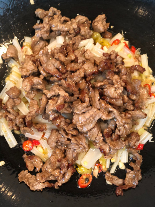 倒入过好油牛肉,加少许料酒,翻炒1分钟。