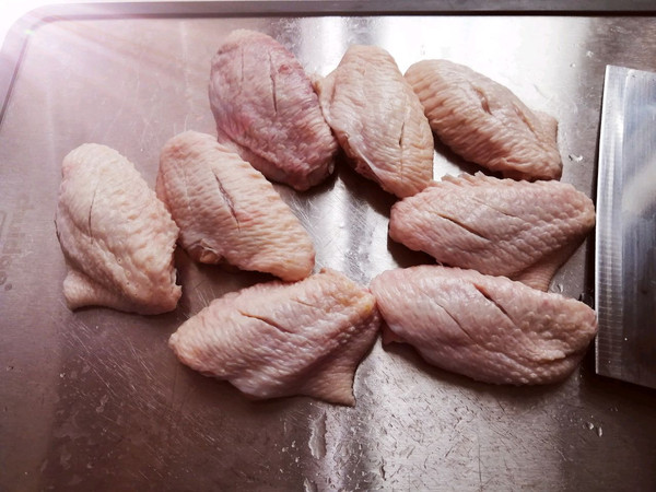 鸡翅清洗干净后,浸泡30分钟去血水。然后捞出控干,用厨房纸吸干表面水份。