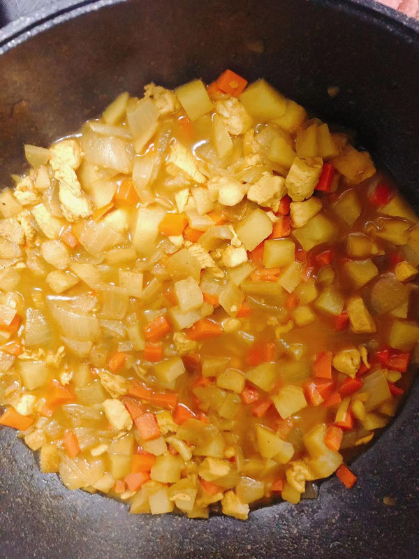 咖喱粉炒至成咖喱油之后加入鸡肉丁和土豆等蔬果丁一起翻炒均匀