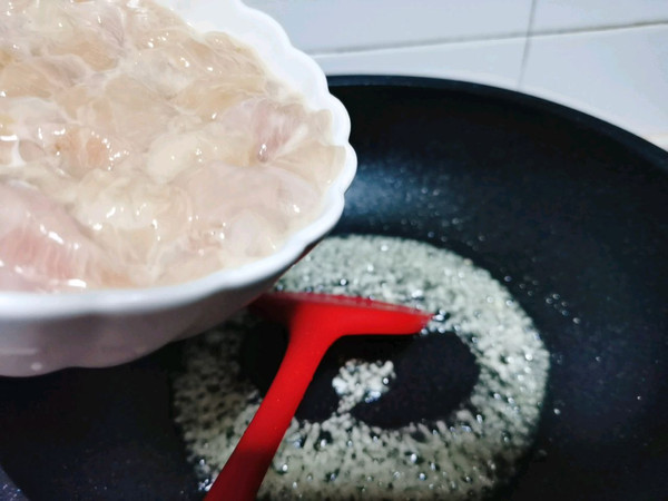 鸡胸肉切成1.5厘米左右见方的丁,加入料酒和淀粉抓匀再加入一个蛋清拌匀,让鸡丁的手感近乎于豆腐为佳。