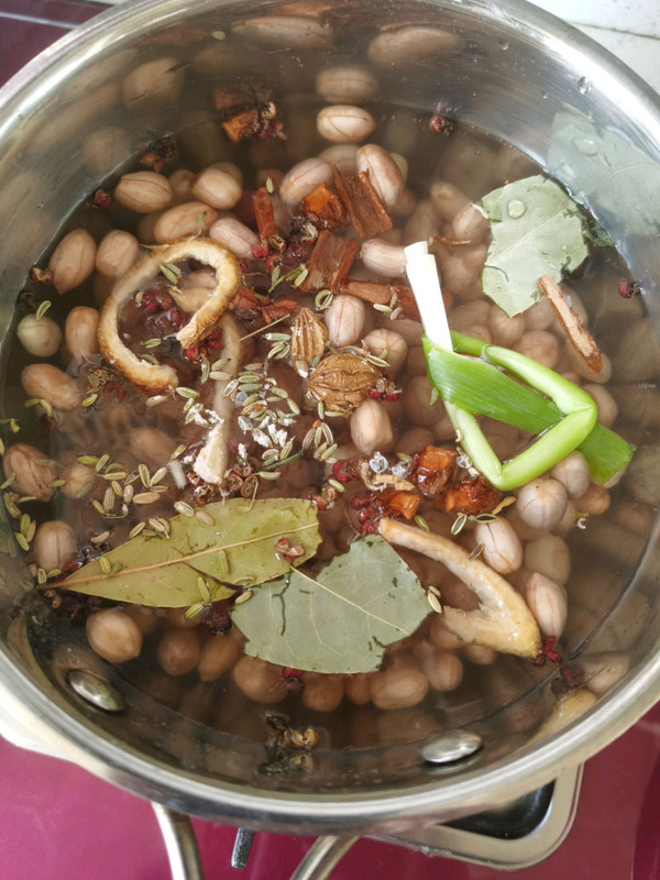 泡好的花生和黄豆分开煮,加入花椒,香叶,橙皮,葱,桂皮,八角盐,少许鸡粉,茴香,白糖少许。 大火烧开15分钟,黄豆也一样。