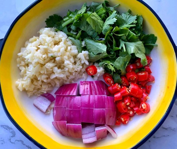 我们先来做一个神仙料汁 小米辣切圈,香菜切断,洋葱切丁,大蒜剁成蓉,装入碗中备用