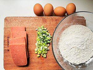 ❣️准备好所有食材 ❣️火腿肠➕鸡蛋➕面粉➕水➕葱花➕豆瓣酱(自己喜欢吃的酱就好) ❣️火腿肠切成片