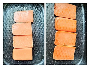 ❣️火腿肠在锅里煎至两面金黄色,盛出备用