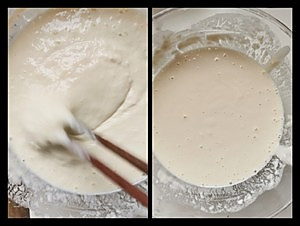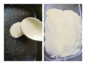 ❣️起锅刷油,油热放一汤勺面糊,用勺子均匀晕开,摊成薄薄一层,中小火哦