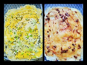 ❣️趁鸡蛋没有完全凝固,撒上葱花个芝麻 ❣️然后等鸡蛋凝固了,翻面,抹上豆瓣酱(选自己喜欢吃的酱)
