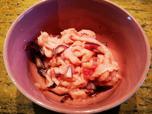 肉片再切丝,放入料酒和洋葱碎腌制15分钟去腥。