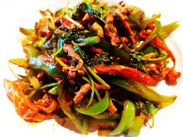 这时可以加入尖椒,继续翻炒直到尖椒上色