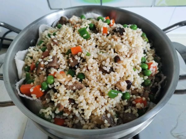 油加热到8成热后,先下肉丁和腊肠丁翻炒几下,再把香菇丁胡萝卜须丁豌豆粒一起加进去翻炒,全程大火,熟了就行,然后加两小勺盐,味精或鸡精一小小勺提味。