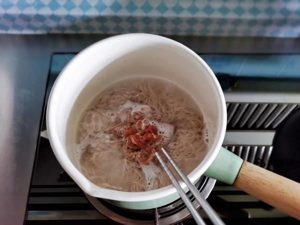 汤锅里加一碗水烧开,放入龙须面,煮沸腾,转小火煮一分钟