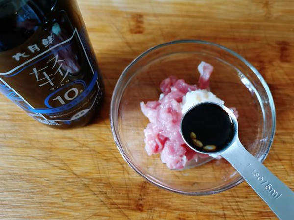 油菜叶子清洗干净,切成碎末,瘦猪肉温水清洗,切成细细的肉丝,装碗里加一勺甜米酒