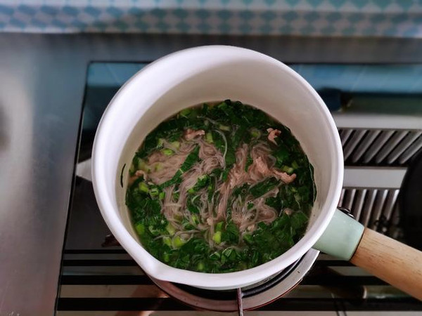 加入油菜叶碎用筷子搅散,煮半分钟即可关火