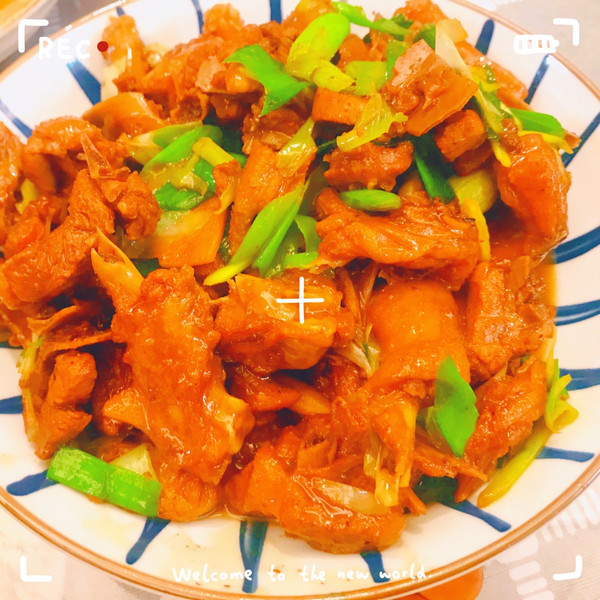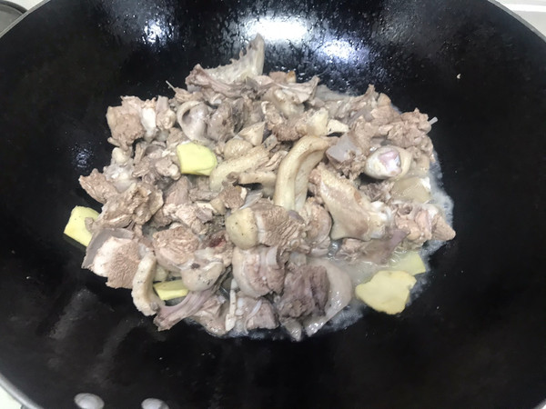 起锅热油,放入姜片炒香,倒入鸭肉炒干水份出点油。