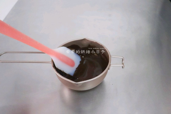 把黑巧克力液慢慢加入到打发好的淡奶油中。