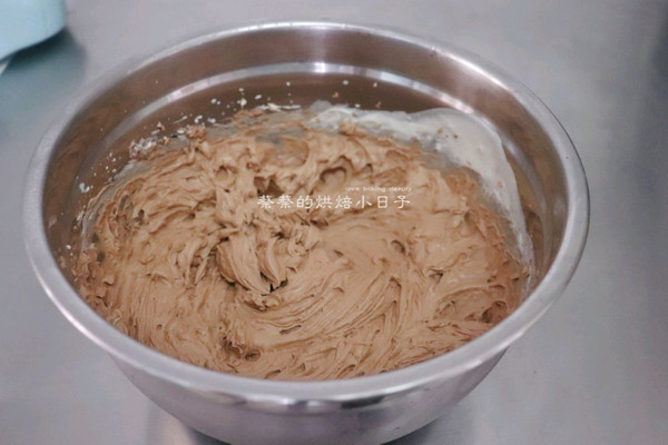可以用Z字法也可以用翻拌的方法,后蛋法拌好的可可蛋黄糊细腻光滑无颗粒。