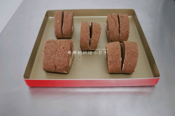 把做好的蛋糕卷头尾两端切去一点点,再分成5大块。在每一块的中间再切上一刀,注意不要切断。
