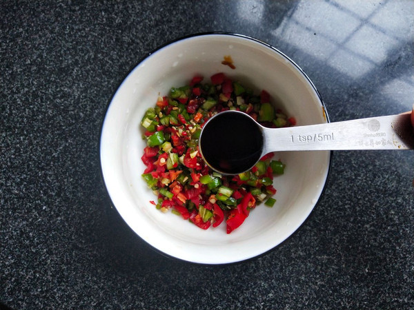 尖椒末、蒜末放入碗中,加1勺蚝油