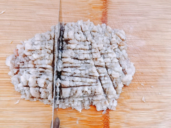用刀背剁成肉泥。家里有绞肉机的也可以交给绞肉机操作,不过我还是习惯手工操作。