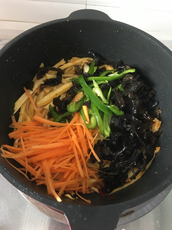 所有食材洗干净 胡萝卜木耳青椒切丝 杏鲍菇用手撕成丝