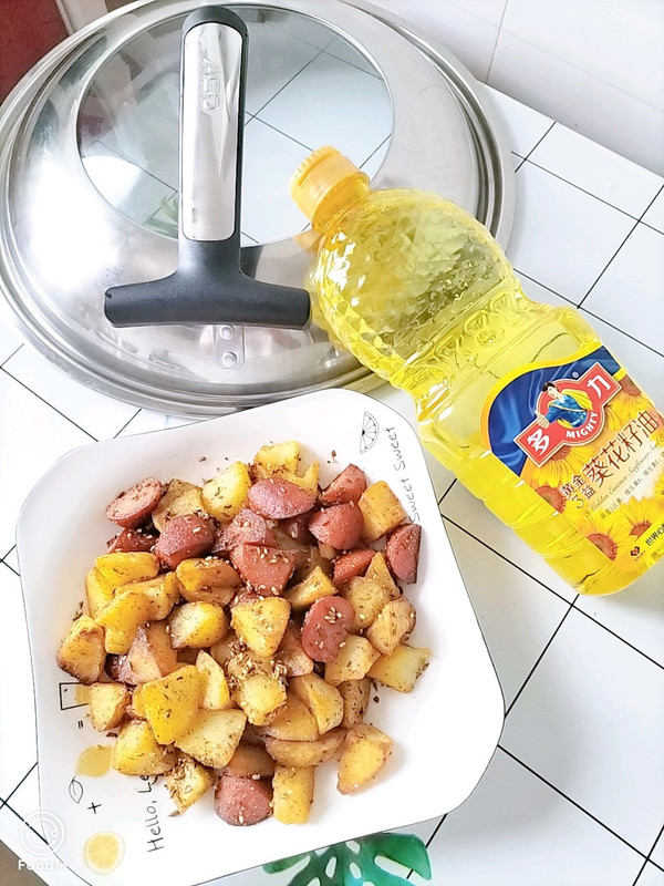 准备好孜然粒,孜然粉,辣椒面,白芝麻,烧烤料,盐,锅留底油,油热下准备好的料翻炒出香味,再下入土豆和香肠翻炒均匀,再撒少许盐,翻炒几下,就可以出锅了