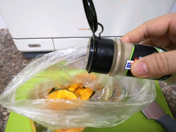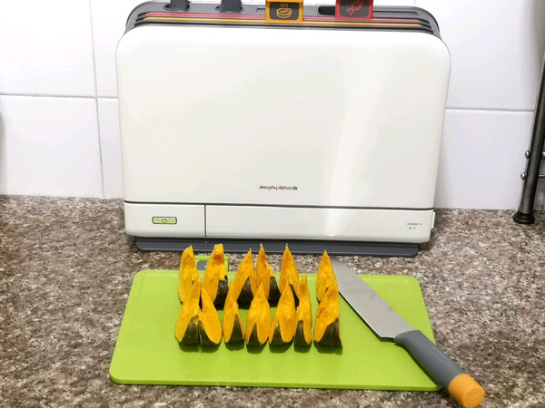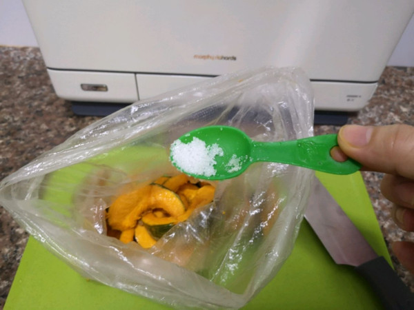 小南瓜洗净放在果蔬砧板上对半切开,去掉瓜瓤,切成小块!摩飞刀筷砧板消毒机自带三块彩色砧板,不同颜色很好区分