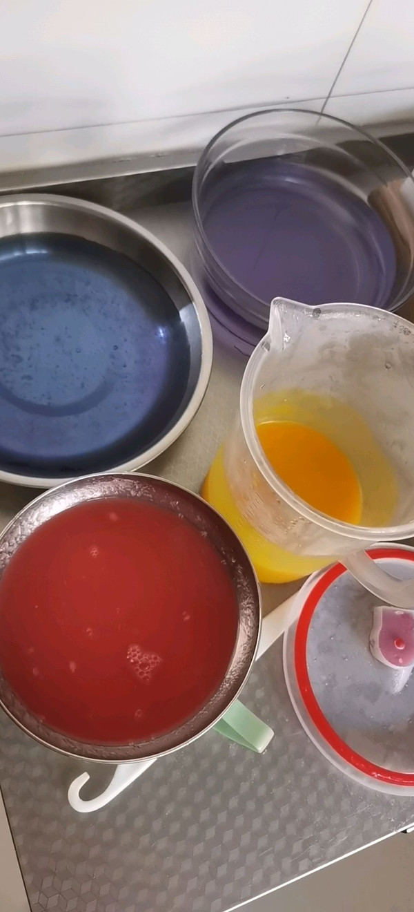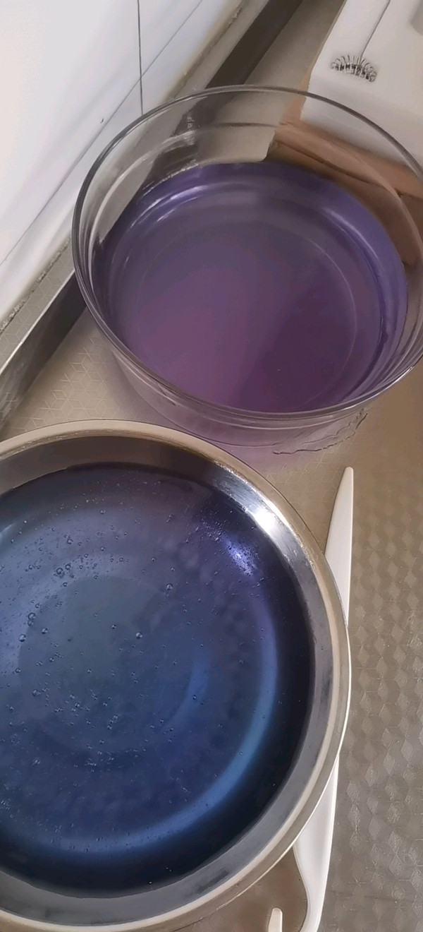 蝶豆花加水加砂糖加白凉粉煮开分两个容器