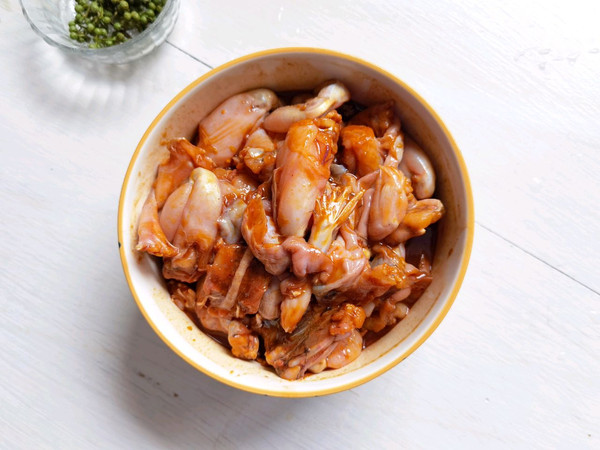 将牛蛙洗净,沥干水分,剪成小块。加入白胡椒粉、少许盐、小苏打,抓匀备用,倒掉多余的血水。