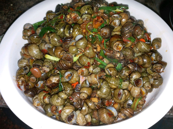 所有配料炒香,下田螺翻炒均匀,倒入2瓶啤酒,盖盖焖20分钟左右