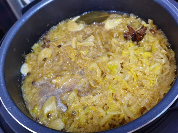 最后一步加入酸菜,加入盐,鸡精即可。盖上盖子炖20分钟即可。我用的是电压力锅哦。