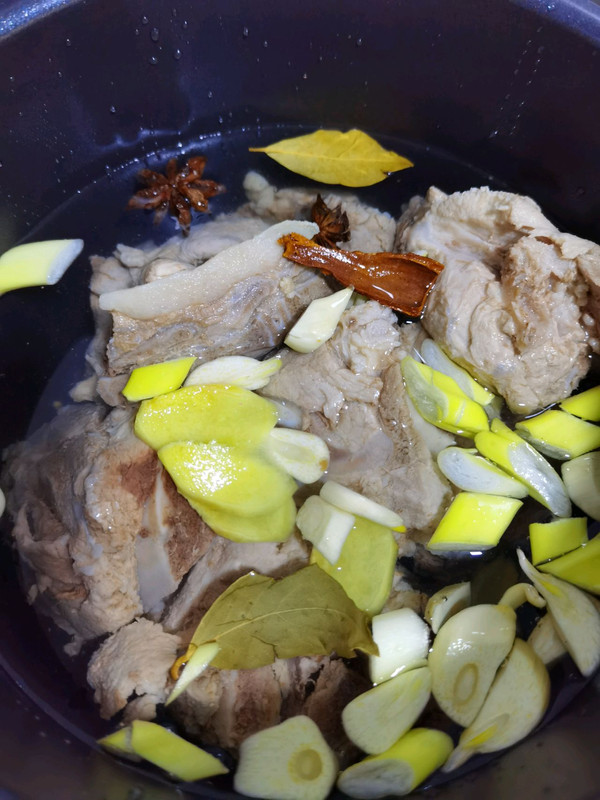 准备工作做好之后,把大骨,葱,姜,蒜,八角,桂皮,香叶,花椒,酱油,蚝油,放入锅中,加入冷水。