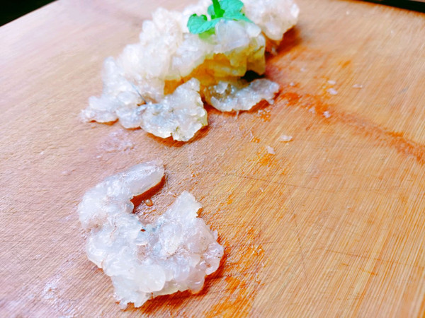 压平的虾用刀背将其敲成蓉,这样处理的虾,颗粒分明,更有弹性。