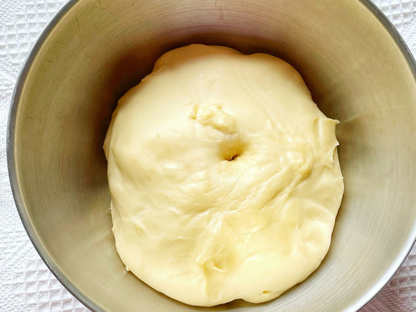 7,揉好的面团放置在温暖的地方进行一发,发酵至2倍大小,发酵完成后可以用手指戳个洞检验,不回缩不塌陷即可。