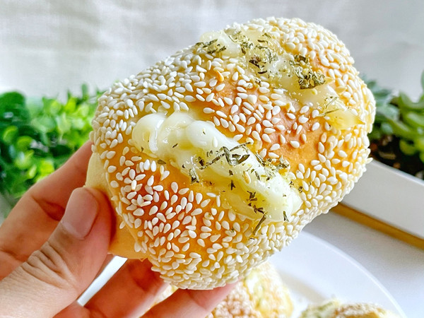 15,整好形后,将面包放在芝麻里,让芝麻粘在面包上
