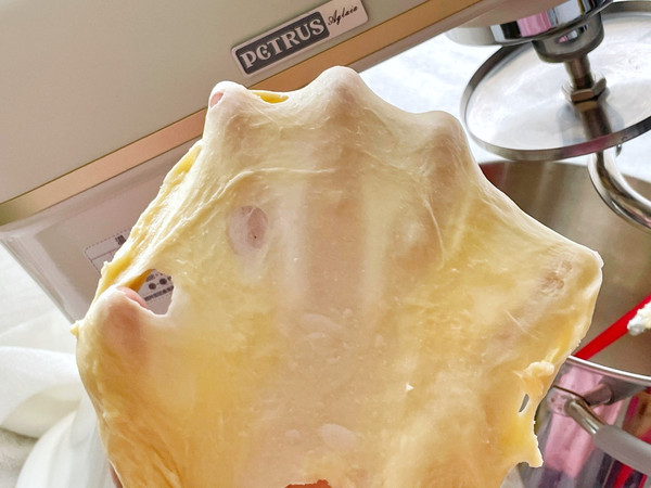 3,除了黄油外所有材料放入厨师桶,先低速揉2分钟,揉出粗膜