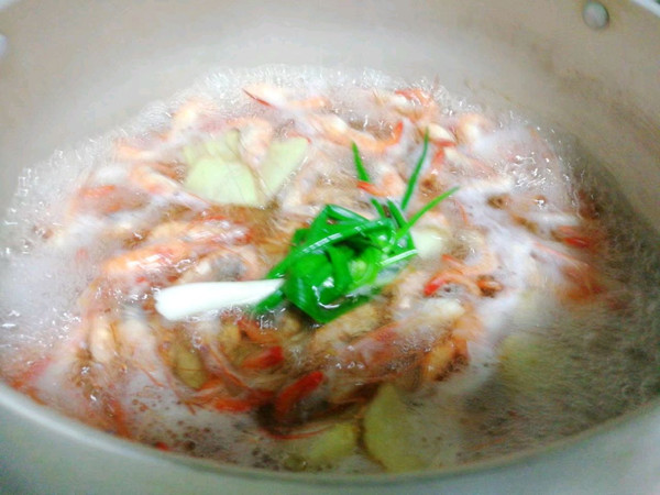 锅内加入适量水煮开,加入食用盐和生姜煮1分钟左右,让生姜味道煮出来,倒入河虾和香葱结继续煮开,加入料酒后,把虾煮熟即可出锅。