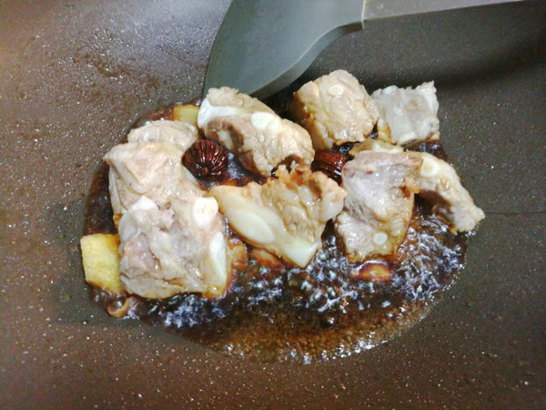 锅内加入1勺食用油烧七分热,放入排骨煎炒一下,放入辅料和调料汁翻炒均匀。