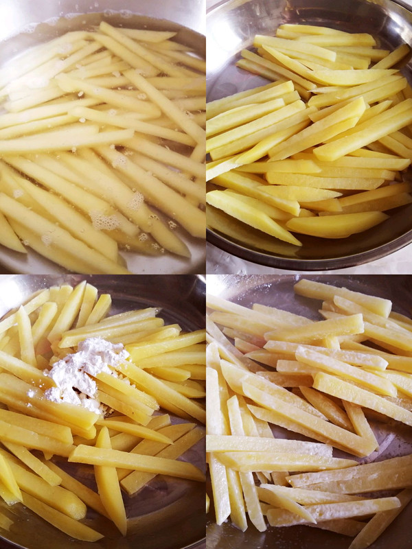 锅里水开后,放一勺盐,下入土豆条焯半分钟,捞出来控干水份。然后加入一勺盐,两勺生粉,少许白糖,充分拌匀。