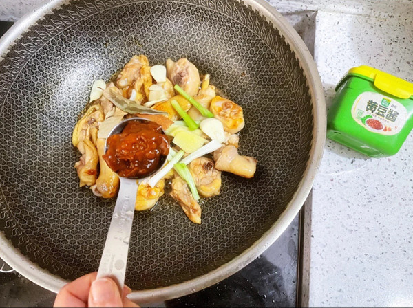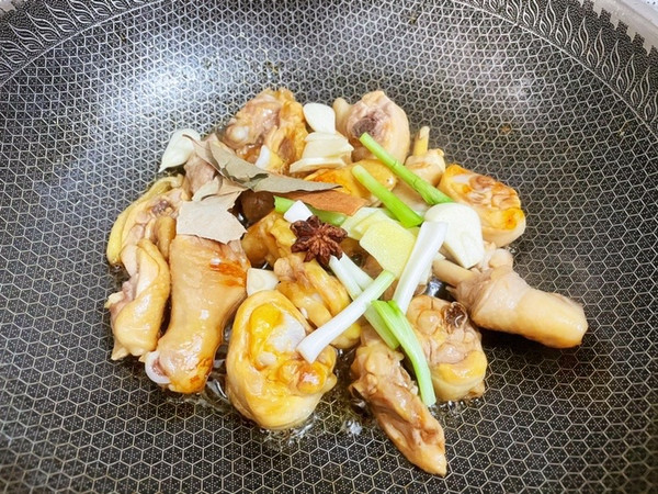 加入鸡腿,炒至上糖色
