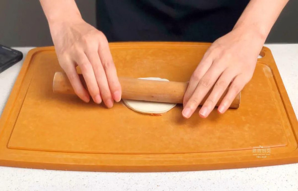 再放上少量肉馅,盖上一张饺子皮(一共是3张饺子皮、2层肉馅);