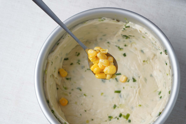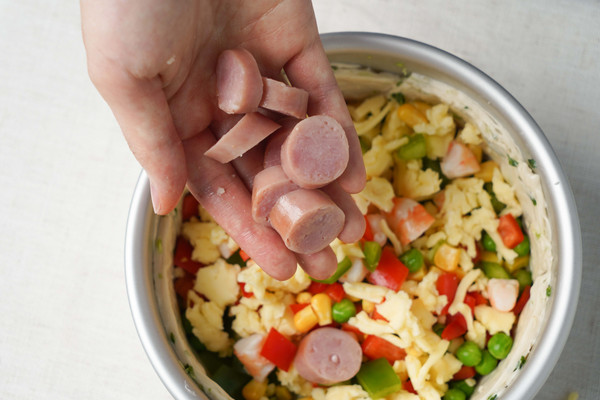 放入玉米、青豆、甜椒、虾仁、香肠、马苏里拉芝士