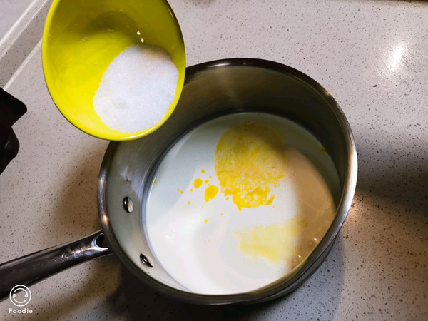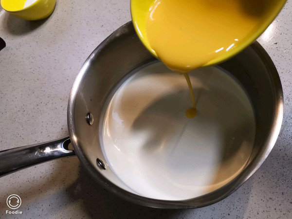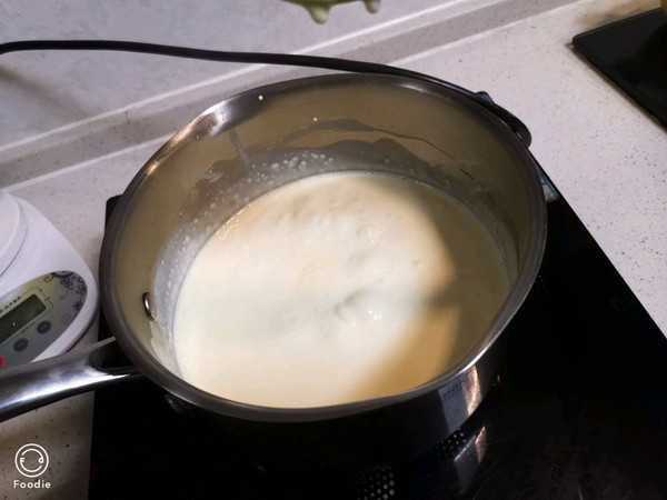 将淡奶油混合液小火加热,边加热边不停搅拌,避免糊底。