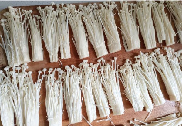 晾干水分,去除金针菇的根部,根部不要切太多,不然金针菇容易散,把金针菇分成均匀的等分,摆放在案板上,以防炸的时候手忙脚乱。