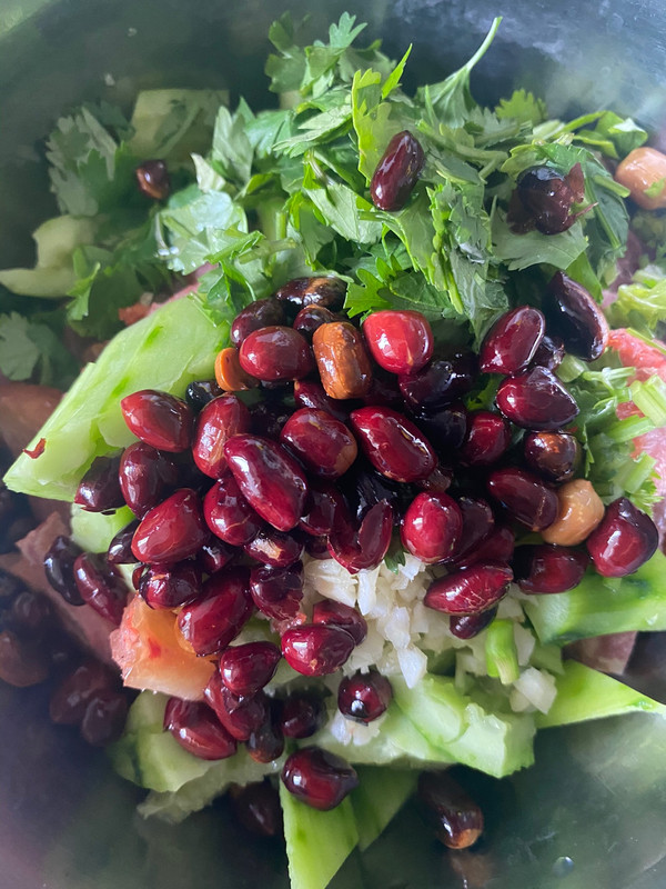 酱牛肉切片、黄瓜拍碎切块、放入蒜末、香菜、花生米、盐、鸡精、生抽、陈醋、香油、辣椒油拌匀就可以~