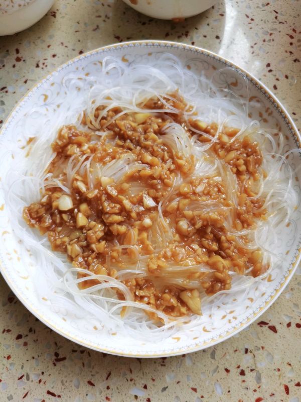 放上蒜蓉酱,这个蒜蓉酱做法在之前的菜谱里有,因为蒜蓉酱是咸的,就不用再加调味料了!