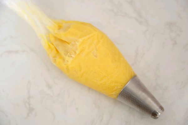 把泡芙横着切开,挤上奶油放上大块芒果果肉