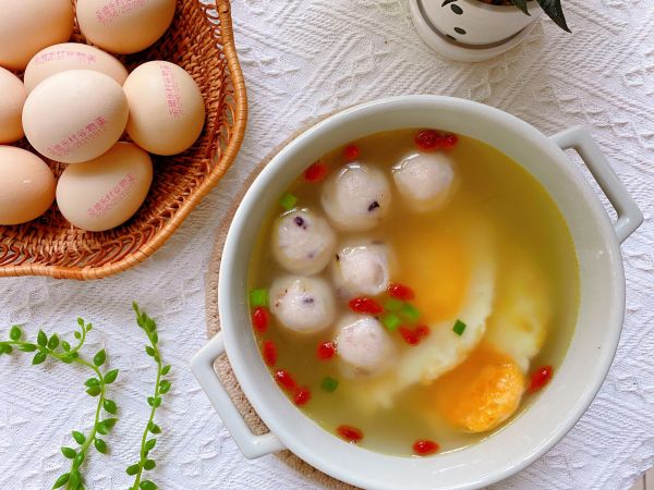 锅中加水烧开,放入煎好的鸡蛋大火煮,中途放盐,胡椒粉,丸子,煮到汤色有些发白就可以出锅了,出锅前撒上葱花和枸杞