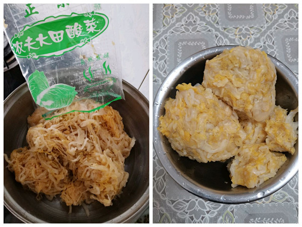 将酸菜倒入盆中用水清洗三遍,攥干水分备用