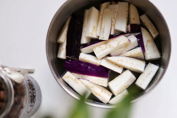 茄子洗净切条,放入白醋水中浸泡片刻。紫薯洗净去皮切丁,和大米一起入锅蒸煮,鸡胸肉打花刀加生抽料酒姜片腌制几分钟