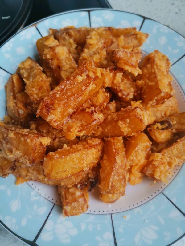 油5成热,下入南瓜条,炸至金黄捞出