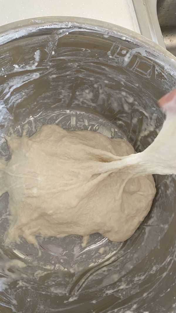 一直到水全部加入,这个时候的面团呈糊状,难以成型。放到常温处醒发两个小时左右至面团两到三倍大,里面全部是蜂窝状。